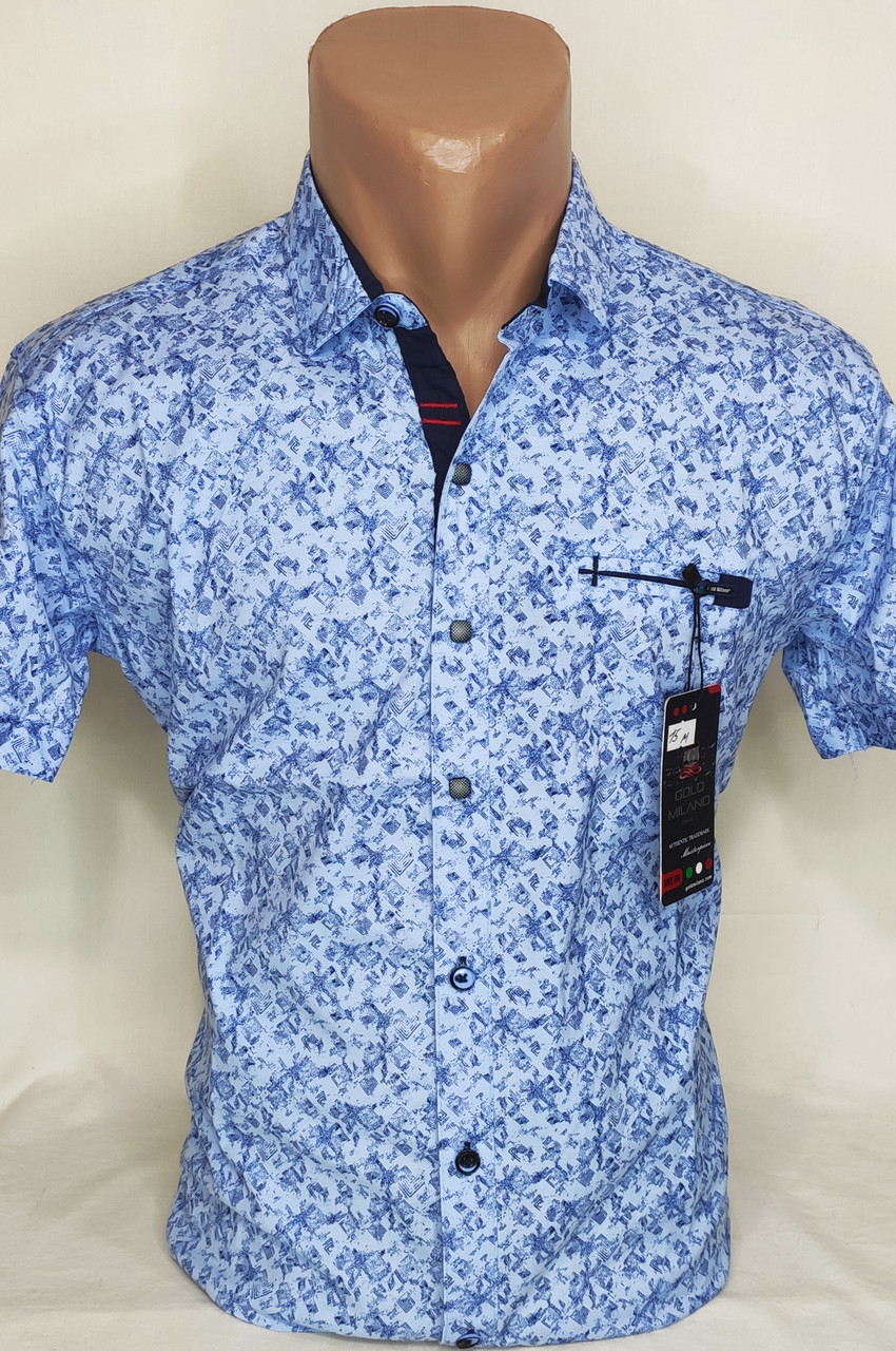 Сорочка чоловіча стильна Gold Milano vк-0015 блакитна приталені у візерунок Туреччина з коротким рукавом теніска ошатнаСтильна чоловіча сорочка з коротким рукавом (теніска) блакитного кольору в синій візерунок приталеного силуету. Має плоский комір з оздобленням синього тону під коміром , планкою і рукавами. Застібається на ефектні кнопки і ґудзики, кишені обман з логотипом фірми від фабричного Турецького виробника Gold Milano