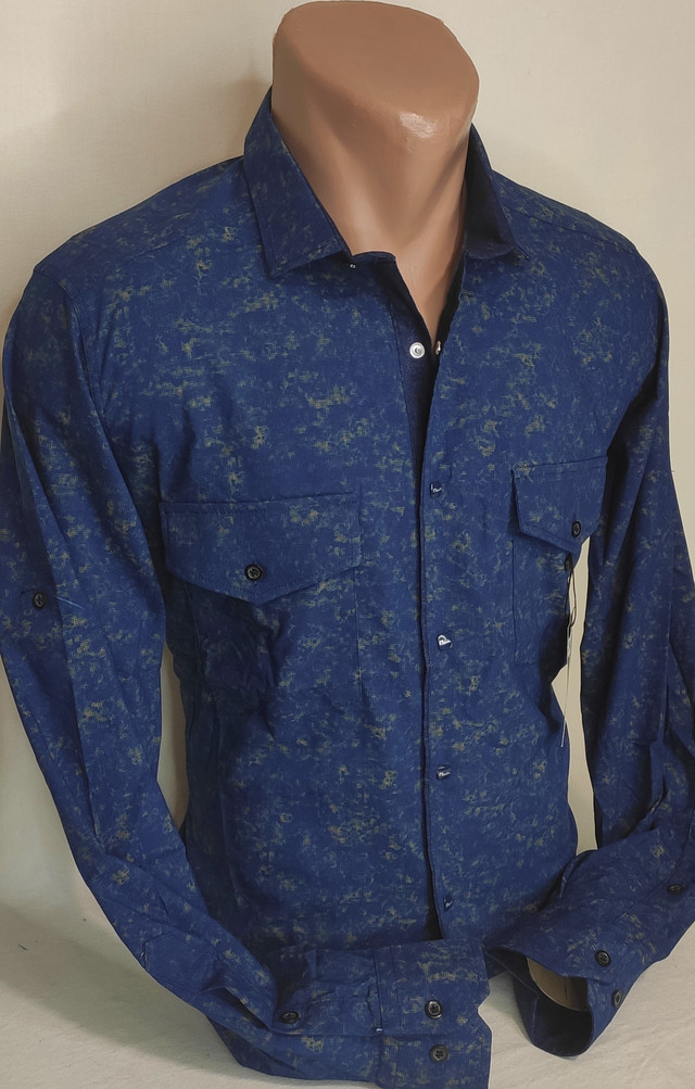 Чоловіча сорочка синього кольору в легкий жовто-синій візерунок приталеного силуету. Має плоский комір, обробки синього тону під коміром, манжетами і під планкою, застібається на ефектні кнопки і гудзики. Рукав сорочки довгий трансформер (закочується і застібається на шлейку). З двома нагрудними кишенями, що застібаються на клапан з гудзиком.