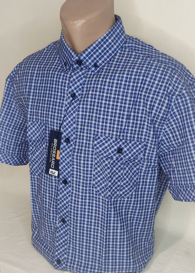 Чоловіча класична сорочка з коротким рукавом (шведка) блакитного кольору в дрібну біло-блакитну клітину. Має класичний комір застібається на потайні гудзики, повністю застібається на ефектні гудзики , двома кишенями з клапанамивід фабричного Турецького виробника Brossard