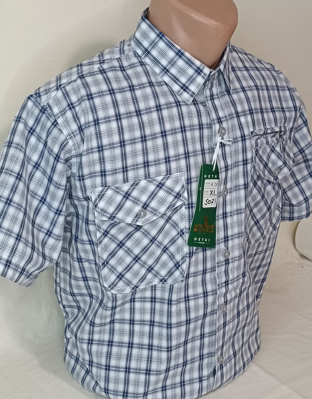 Теніска чоловіча з коротким рукавом бавовна 100% Hetai від фабричного китайського виробника. У середню клітку з двома великими кишенями з клапанами на ґудзиках та третю кишеню на блискавці. Під коміром оздоблення синьо-білого тону, натуральна.