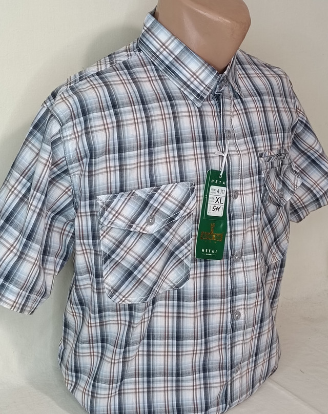 Теніска чоловіча з коротким рукавом бавовна 100% Hetai від фабричного китайського виробника. У середню клітку з двома великими кишенями з клапанами на ґудзиках та третю кишеню на блискавці. Під коміром оздоблення синьо-білого тону, натуральна.
