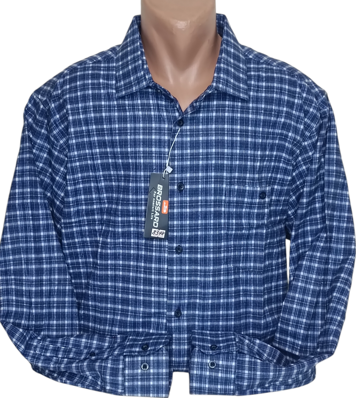 Тепла кашемірова чоловіча сорочка Батал Великан із довгим рукавом , от фабричного виробника Brossard. У синю середню клітку, з однією кишенею застібається на ґудзик. Має класичний комір і повністю застібається на ефектні ґудзики.