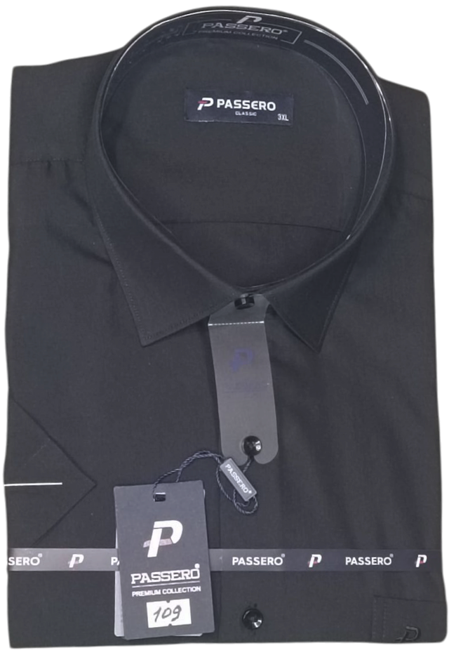 Чоловіча класична сорочка з коротким рукавом ( теніска) однотонна, батальної серії від турецького виробника Passero чорного кольору . Сорочка має класичний комір. Повністю застібається на ефектні круглі ґудзики, з однією кишенею.