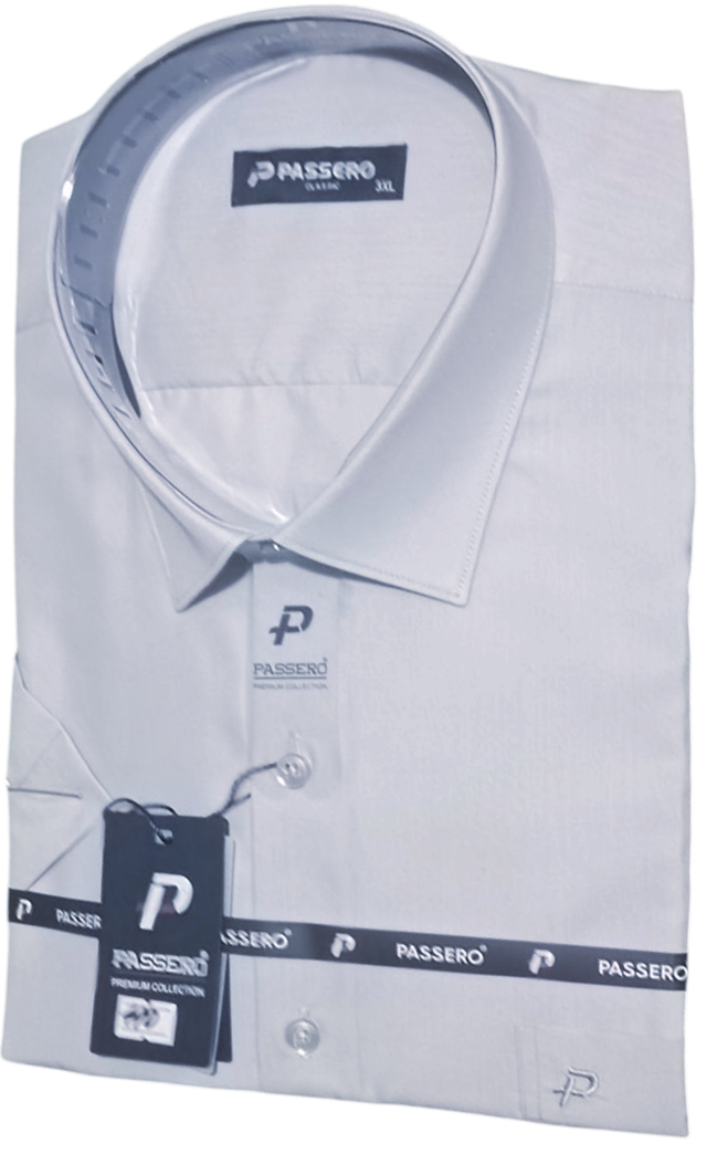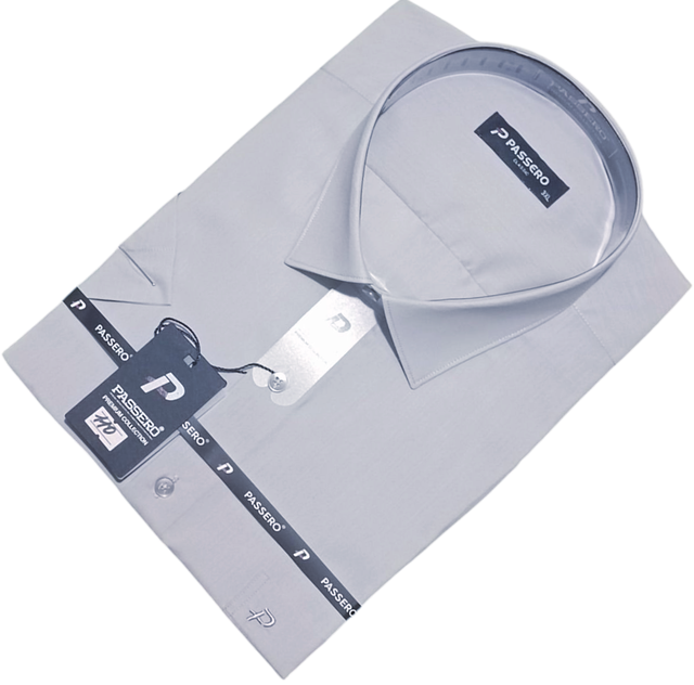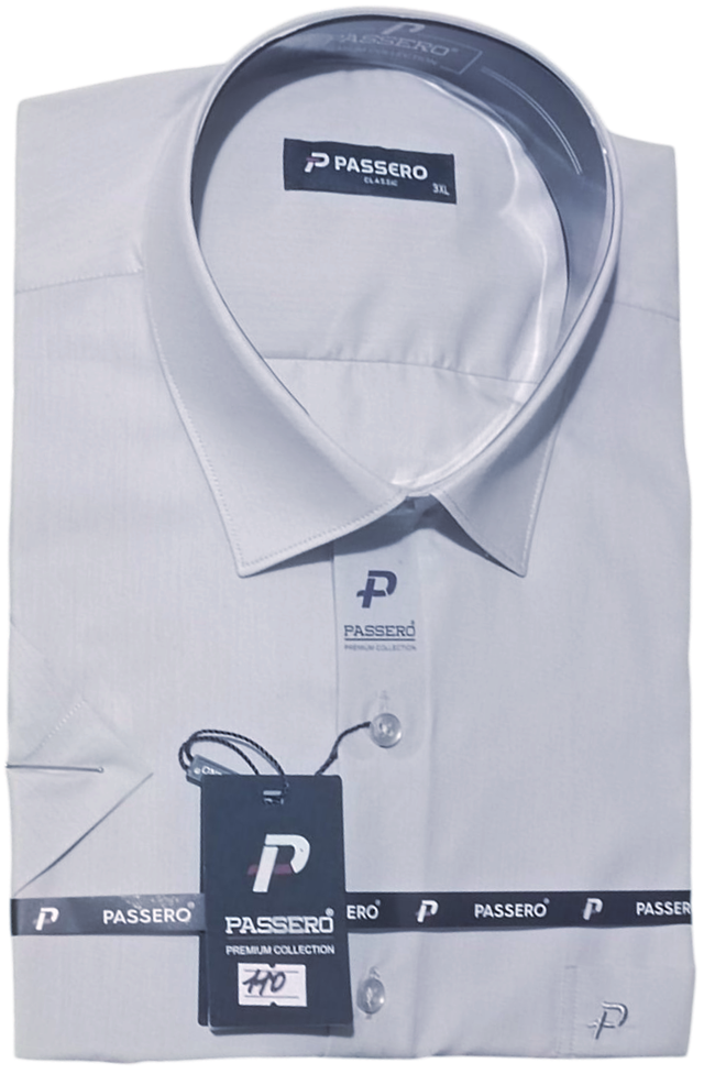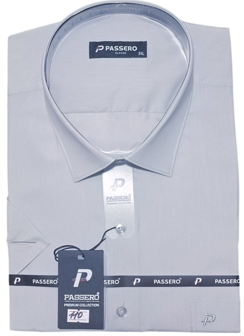Чоловіча класична сорочка з коротким рукавом ( теніска) однотонна, батальної серії від турецького виробника Passero світло-сірого кольору . Сорочка має класичний комір. Повністю застібається на ефектні круглі ґудзики, з однією кишенею.